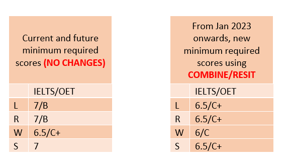 The significance of this new minimum score using the combine/resit is it drops 0.5 score (IELTS) and half score (OET). This means that when combining scores one from previous test and one from current one, you may use the new scores as a guide to check if you are eligible or not. By simply following the standard score of passing, and by checking the minimum in the combined scores, you can determine the outcome of the result.